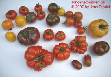 Es war nicht zu erwarten, daß 2007 noch erfolgreicher wird als das Vorjahr, aber auch nicht, daß es gleich so problematisch wird. Der Sturm Kyrill zerstörte am 18. Januar mein Tomatendach, eine umfangreiche Saatgutbestellung beim Bohl'schen Samenarchiv ging verloren, die gerade erst gepflanzten Tomaten wurden durch einen ungewöhnlich heftigen Hagelschauer am 26. Mai schwer geschädigt und das Wetter war über den ganzen Sommer und Herbst hinweg nicht so, wie es Tomatenpflanzen lieben. Der Erntebeginn verzögerte sich bei den meisten Sorten um 2 bis 3 Wochen und entsprechend geringer fiel die Ernte aus. Es bleibt die Hoffnung auf ein besseres Tomatenjahr 2008!