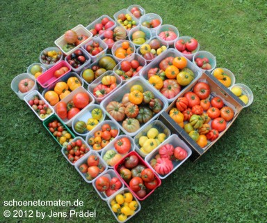 70 Sorten waren geplant. 65 Sorten konnten erfolgreich angebaut werden. Erstmals hatte ich eine "blaue" Tomate (Blue OSU) versucht, deren Früchte wirklich eine ungewöhnliche schwarzbraun-violette Färbung schon im unreifen Zustand haben, aber von einem reinen Blau doch noch ein ganzes Stück weg sind. 2012 war ansonsten ein normales Tomatenjahr mit einer ertragreichen Ernte. Eine Überraschung war die Sorte "Brasil wild", die, obwohl nicht überdacht, dem enormen Braunfäuledruck im Spätsommer/Frühherbst trotzte.
