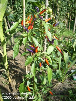 Die zumeist aufrecht stehenden Früchte sind zunächst tatsächlich lila, reifen dann aber über beige nach hellrot bis dunkelrot ab, wobei sie an Schärfe gewinnen.