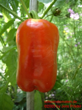 mittelgroße, meist gerade, spitze, dünnwandige und nicht sehr saftige, rote Früchte