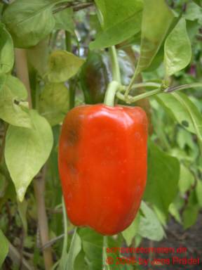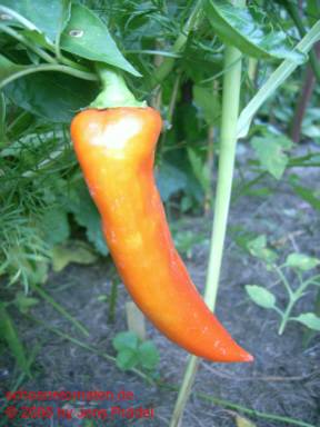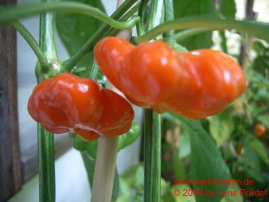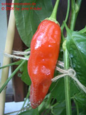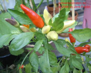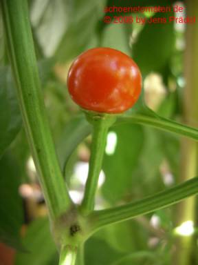 Die kleinen (6 bis 8 cm lang), etwas knautschigen, rot abreifenden Früchte sehen wie harmloser Paprika aus. Unter Umständen wird man da schnell eines besseren belehrt, denn teilweise sind die Schoten sehr scharf.
