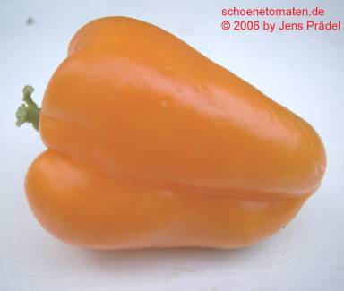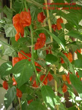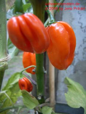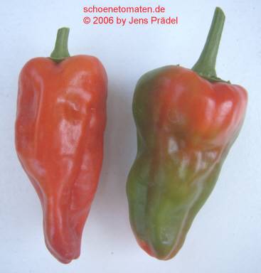 Den Samen zu dieser Sorte, erhielt ich im Tausch unter dem Namen "Baumchili". Mittlerweile weiß ich dank eines Hinweises eines aufmerksamen Lesers und Chili-Experten, daß es sich bei dieser Sorte keinesfalls um Baumchili (capsicum pubescens) handelt, da alle entsprechenden Merkmale wie schwarzbraune Samen, violette Blüten und behaarte dunkle Blätter fehlen. Die vorliegende Sorte gehört, wie zum Beispiel auch die Habanero-Sorten, zur Art capsicum chinense. |