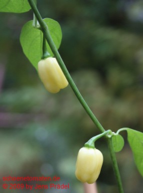 im Vergleich zu anderen Habanero-Sorten relativ kleine (ca. 2 cm lang), tropfenförmige, längs gefurchte, hellgelbe, fast weiße Früchte