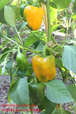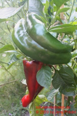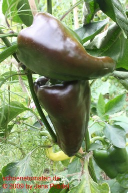lange, flache, dünnwandige, über dunkelolivbraun nach rot abreifende Früchte (Es gibt auch gelbe und orangene Varianten.)