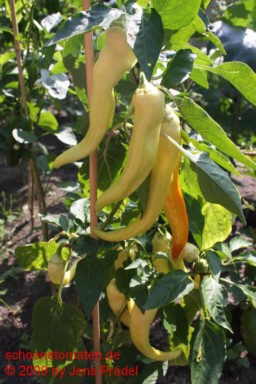 sehr lange, schmale, hellgelbe Früchte, die hellrot abreifen