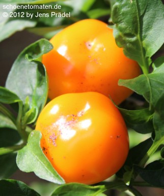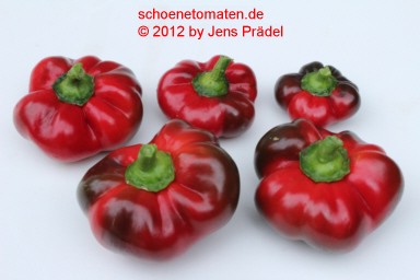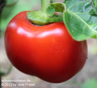 wie große Fleischtomaten aussehende, rote Früchte, breiter als hoch und ohne Rippung (Es ist möglich, daß bei größeren Früchten eine Rippung auftritt.)