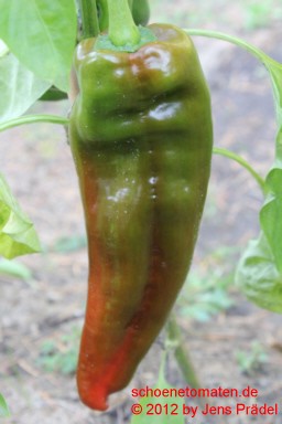 relativ große (bis 8 cm lang und ca. 2,5 cm breit), lang kegelförmige, spitz zulaufende, mal mehr und mal weniger eingedellte, rot abreifende Früchte