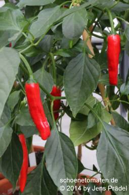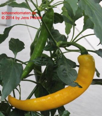 mittelgroße (ca. 1 bis 1,5 cm breit und 4 bis 6 cm lang), meist gerade, aber auch leicht sichelförmige, rot abreifende Früchte, die anders als die gelbe Variante (siehe Mai-Pepper NY) hängend abreifen