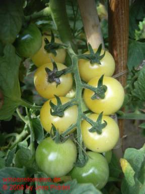 kleine (ø 3 cm und ca. 20 g), runde, hellgelbe Früchte an schönen, gleichmäßigen Rispen