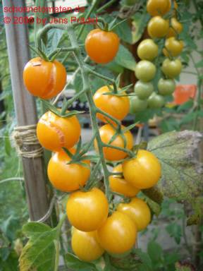 kleine (ø 2,5 bis 3 cm und 10 bis 15 g), runde, goldgelbe bis orangefarbene Früchte in gleichmäßigen Trauben, nicht platzfest