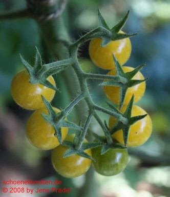 sehr kleine (ø 2 cm und ca. 3 bis 10 g), runde, weiß-gelbe Früchte, fast durchgängig 7 oder 8 Früchte je Fruchtstand