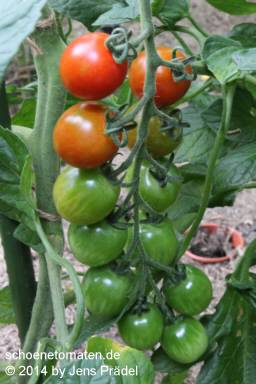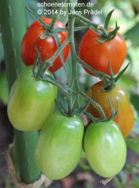 kleine (ø 3 cm), 15 bis 20 g schwere, runde bis leicht hochrunde, rote Früchte an langen Rispen