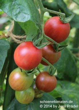 kleine (ø 3 bis 3,5 cm), 10 bis 20 g schwere, runde, dunkelrote Früchte