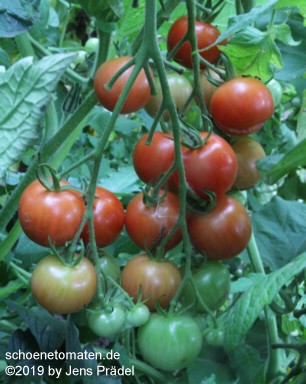 kleine (ø 4 bis 4,3 cm), 20 bis 30 g schwere, runde, rote Früchte an schönen, gleichmäßigen Rispen