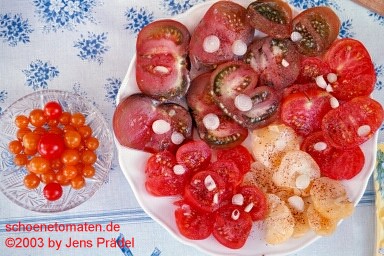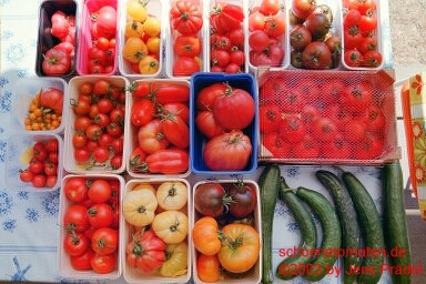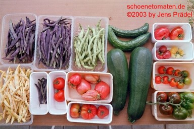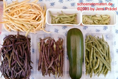 Die violetten Bohnen auf dem rechten Foto sind Stangenbohnen, die bei uns in der Familie unter dem Namen "Blauer Speck" bekannt sind. Sie sind äußerst schmackhaft und ertragreich. Es ist wohl eine amerikanische Sorte, die mein Opa bereits vor 50 Jahren angebaut hat.