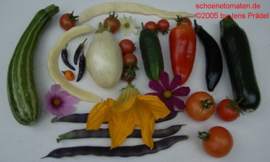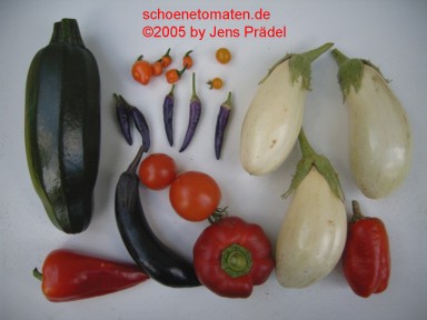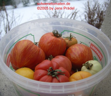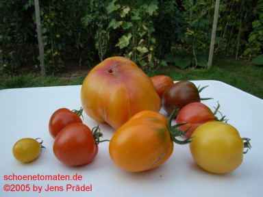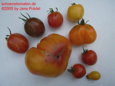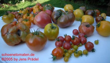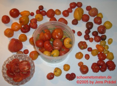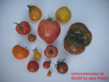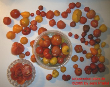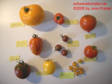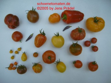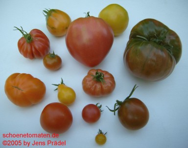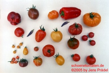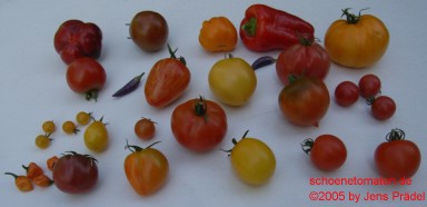 u.a. Ananas-Tomate, Beuteltomate aus El Salvador, Hank, Japan Golden Pear, Miss Kennedy, Schimmeig Greg, Moneymaker, Lila Sari, Mrs. Pinky, Georgia Streak, Schmatzefein,, Carotina, Santa Ana, Stupicke, Apollo, Baiguo Quiangfeng, Laternchen