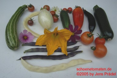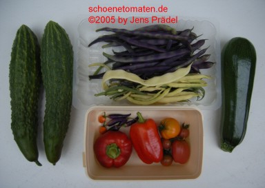 Mitte: Gurke Soo Yoh Long, verschiedene Tomaten,