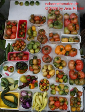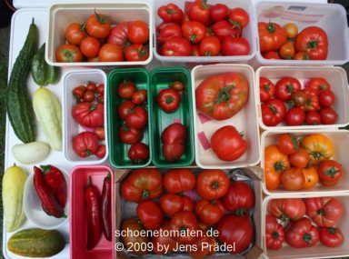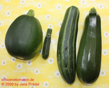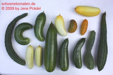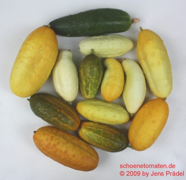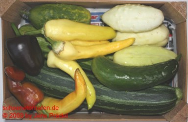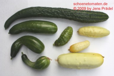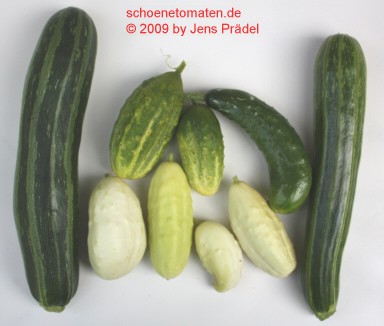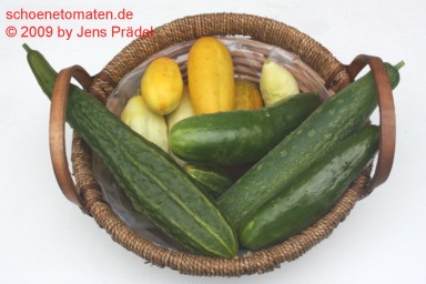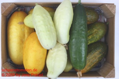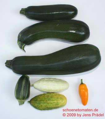 Zucchini Black Forest, Gurke Long White, Gurke Phoona Kheera und Miniausgaben von Zucchini Cococelle von Tripolis und von Paprika Quadrato d'Asti Giallo