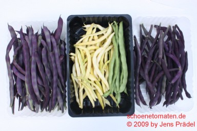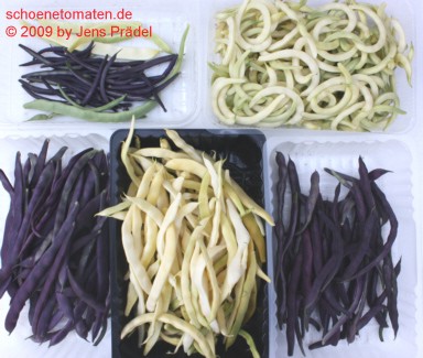 links: Stangenbohnen Blauer Speck, Neckargold, Brita's Foot Long, Blauhilde