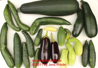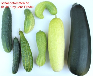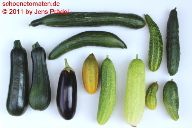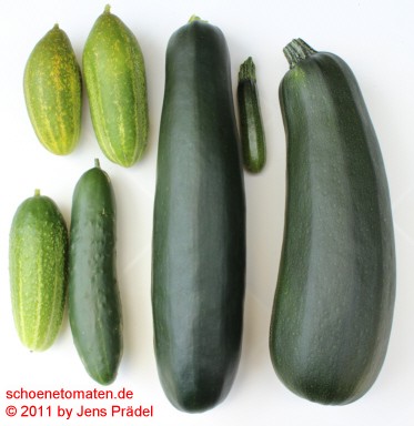 Sorten: Gurken Vorgebirgstrauben (oben links), unten von links: Gurke Mervita, Gurke Akito, Zucchini Ambassador, Zucchini Black Forest