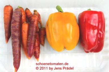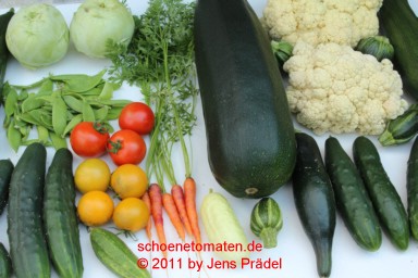 Gurken, Zucchinis, Kohlrabis, Blumenkohl, Zuckerschoten, junge Möhren der Sorte Purple Haze und die ersten Tomaten