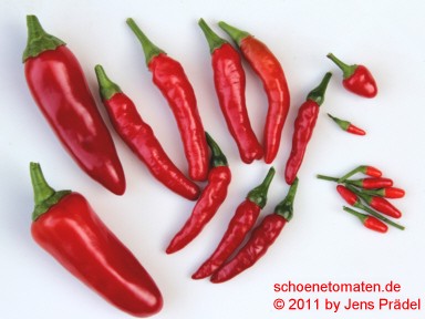 Chili: Abbreviatum, Bonsai-Chili, Fresno, Fireflame, Elefant, Filius Blue, Kleiner Ungar, Serrano, Chupetinha, Rühlemanns Mini-Chili