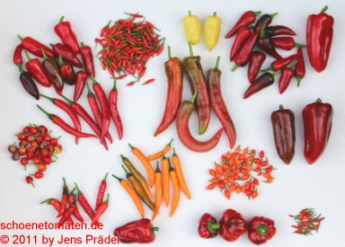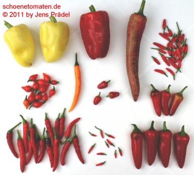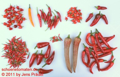 Zlata (oben links), Neusiedler Ideal (oben Mitte links), Elefant (oben Mitte rechts), Bonsai-Chili (oben links), Chupetinha (Mitte links), Serrano (Mitte Mitte links), Filius Blue (Mitte Mitte rechts), Abbreviatum (Mitte rechts), Kleiner Ungar (unten links), Rühlemanns Mini-Chili (unten Mitte), Abbreviatum (unten rechts)