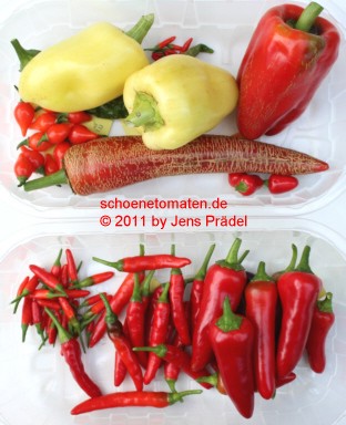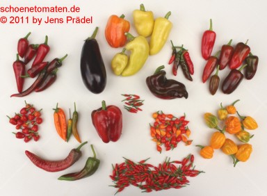 Chili: Fresno, Fireflame, Kleiner Ungar, Abbreviatum, Filius Blue, Serrano, Rühlemanns Mini-Chili, Chupetinha, Habanero orange, Elefant, Bonsai-Chili