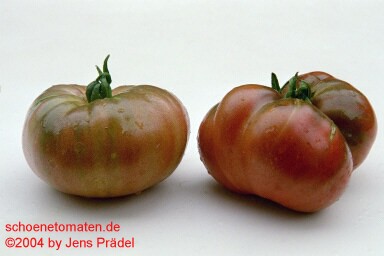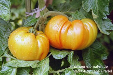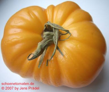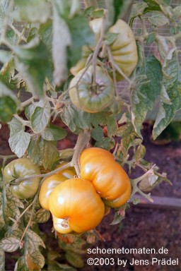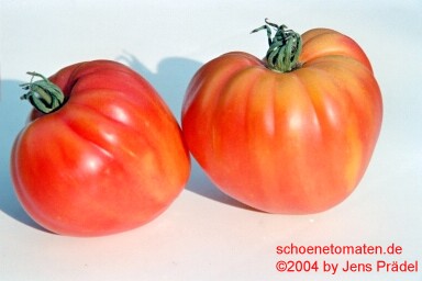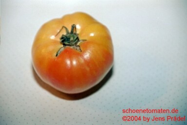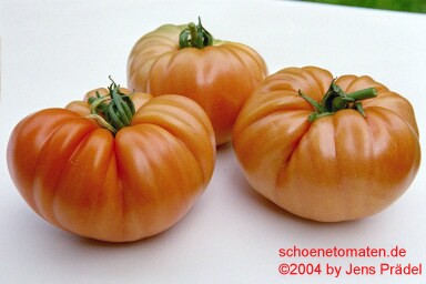 sehr große, herzförmige, leicht gerippte, orangerote Früchte mit gelbgrünen Streifen