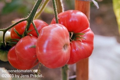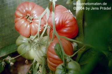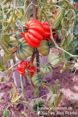 2006 waren die Früchte eher rot mit orangefarbenen Flecken und unterschiedlichen Formen in einer Traube: sowohl breitrund gerippt als auch herzförmig