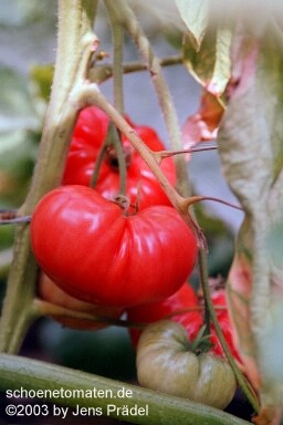 teilweise sehr große, unregelmäßig gerippte, rote Früchte