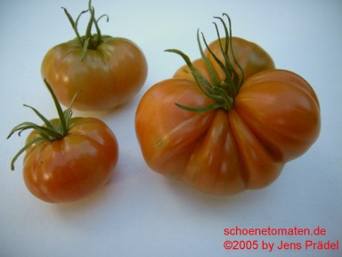 sehr große (250 bis 400 g), runde, nur leicht gerippte, gelb-orange bis zu rote (bei Vollreife) Früchte