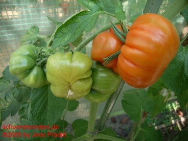 sehr große, überwiegend breitrunde, teilweise leicht gerippte Früchte (aber auch unregelmäßige Formen)