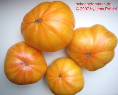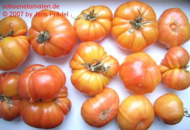 große, plattrunde, gerippte,orangerot gestreifte Früchte