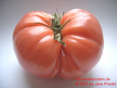 sehr große, überwiegend gleichmäßig runde, ganz leicht gerippte, rosarote Früchte mit unregelmäßigen, breiten, grünen (bei Vollreife orangefarbenen) Streifen und einer kleinen Einsenkung am Fruchtboden
