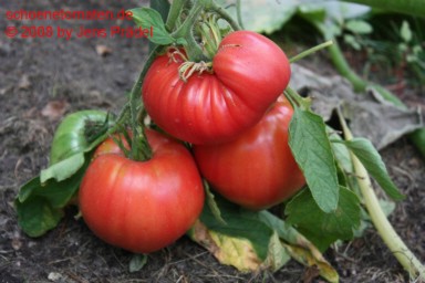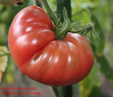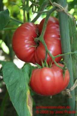 mittelgroße (1,5 bis 1,8 m) Pflanze, kartoffelblättrig später Erntebeginn (Ende August) mittlerer Ertrag sehr große, breitrunde, kaum gerippte, leuchtend rote Früchte größte geerntete Frucht: 445 g schöner Geschmack, saftig und sehr fleischig, schmelzendes Fruchtfleisch |