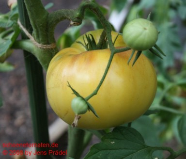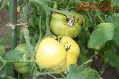 große Pflanze (über 2 m) mittelfrüher Erntebeginn (Mitte August) guter Ertrag riesige, breitrunde, unregelmäßig gekerbte, hellgelbe Früchte mit kleinen orangefarbenen Streifen im Kragenbereich (Fruchtboden fast weißgelb) größte geerntete Frucht: 899 g mildsüßer Geschmack, sehr saftig für Liebhaber großer, gelber Tomaten! |