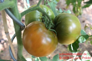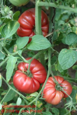 mittelgroße Pflanze (1,7 bis 2 m) sehr später Erntebeginn (Mitte September) geringer Ertrag große, etwas breitrunde, fast glatte, feste, braunrote Früchte größte geerntete Frucht: 282 g schöner Geschmack, saftig, schmeckt so richtig nach Tomate |