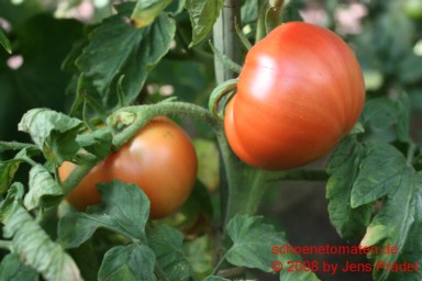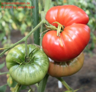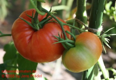 mittelgroße Pflanze (1,4 bis1,6 m) früher Erntebeginn (Anfang August) ertragreich große, sowohl leicht breitrunde als auch herzförmige, meist glatte, manchmal etwas gerippte, rote Früchte größte geerntete Frucht: 408 g köstlicher saftig-milder Geschmack |
