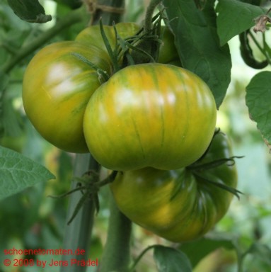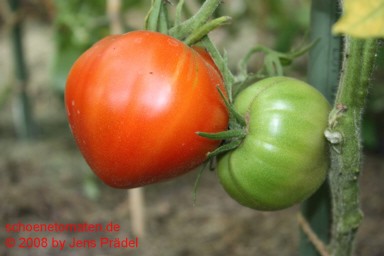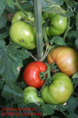 große Pflanze (2 bis 2,5 m) früher Erntebeginn (Anfang August) außerordentlich ertragreich sehr große, flache, breitrunde, gerippte, feuerrot-grün gestreifte Früchte, oft auch ungewöhnliche Formen Die rot-gelbgrüne Maserung durchzieht auch das Innere der Früchte. größte geerntete Frucht (2008): 562 g größte geerntete Frucht (2012): 445 g ausgezeichneter, fruchtig-aromatischer Geschmack, sehr saftig Der Anbau dieser Sorte gestaltete sich 2007 etwas problematisch, war dafür 2008 und 2012 um so erfolgreicher. Diese Sorte braucht einen guten, sonnigen Standort. ungewöhnliches Aussehen, wunderbarer Geschmack und ertragreich - eine außergewöhnliche Tomate! |
