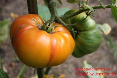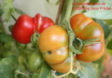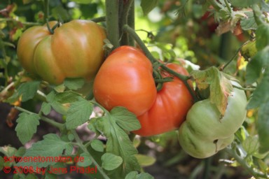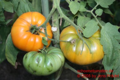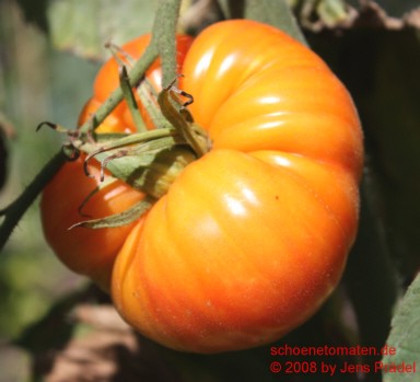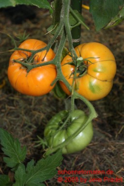 mittelgroße Pflanze (1,6 bis 2 m) mittelfrüher Erntebeginn (Mitte August) relativ geringer Ertrag große, breitrunde, kaum gerippte, orangefarbene Früchte mit meist der Sonne zugewandten roten Bäckchen größte geerntete Frucht: 405 g saftiger, obstiger Geschmack eine schöne und leckere Tomate! |