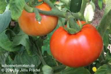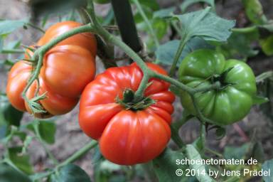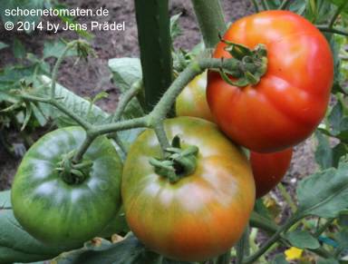 sehr große Pflanze 1,8 bis 2,5 m) mittelfrüher Erntebeginn (Mitte August) ertragreich mittelgroße (ø 6 bis 8 cm), breitrunde, glatte, rote Früchte mit einer etwas rauen Schale im Kragenbereich größte geerntete Frucht: 232 g prima Geschmack, saftig |