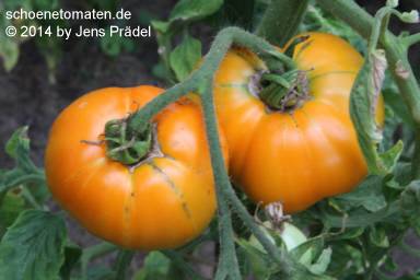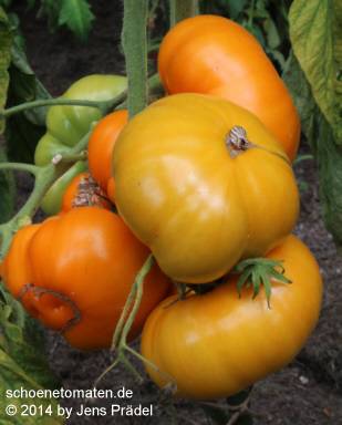 mittelgroße Pflanze (1,4 bis 1,6 m) früher Erntebeginn (Anfang August) sehr großer Ertrag mittelgroße bis sehr große (ø 6 bis 10 cm, 7 bis 8,5 hoch), herzförmige, dunkelgelbe bis orangefarbene Früchte mit stumpfer Spitze teilweise auch unförmige Riesenfrüchte größte geerntete Frucht: 722 g wunderbar fleischig, sehr geschmackvoll eine tolle Sorte! |