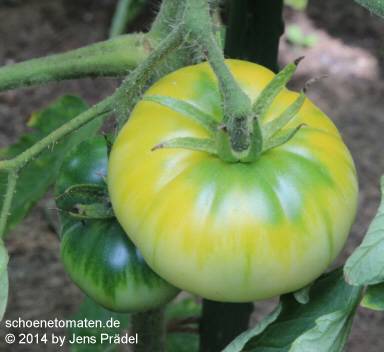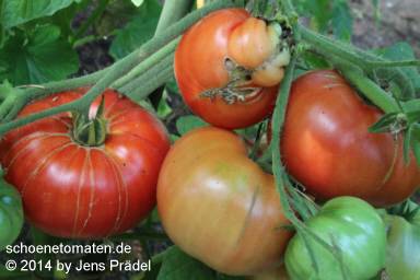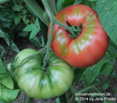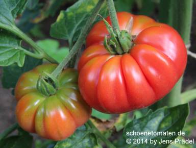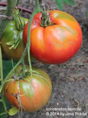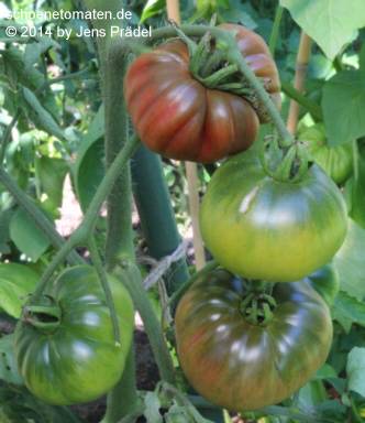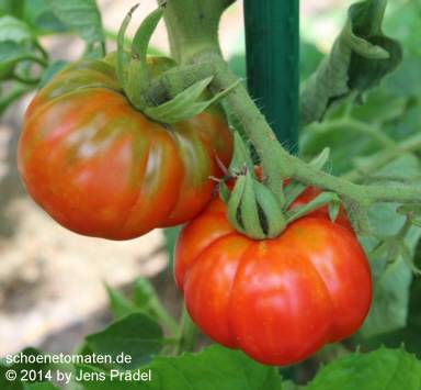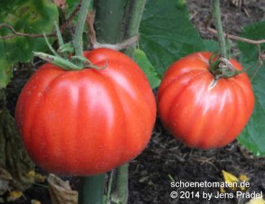 große Pflanze (1,7 bis 2 m) mittelfrüher Erntebeginn (Mitte August) relativ geringer Ertrag große (ø 7 bis 8 cm), breitrunde, unregelmäßig gerippte oder auch fast glatte, nur gekerbte, kräftig rote Früchte größte geerntete Frucht: 230 g sehr fleischig, aromatisch |