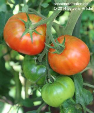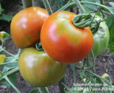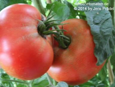 mittelgroße Pflanze (1,3 bis 1,5 m) sehr früher Erntebeginn (Ende Juli) sehr reicher Ertrag große bis sehr große (ø 8 bis 10 cm), überwiegend klobig breitrunde, aber auch herzförmige, satt rote Früchte im Kragenbereich oft orange-grün gefärbt größte geerntete Frucht: 333 g süß-würzig, sehr fleischig, saftig, sehr lecker |