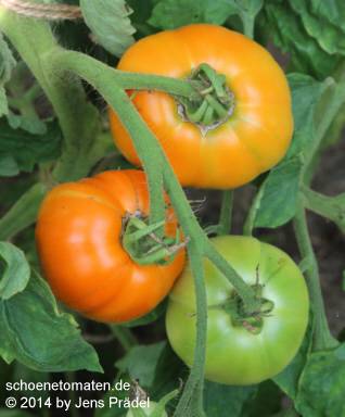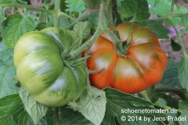 große, kartoffelblättrige Pflanzen (1,9 bis 2,2 m) mittelfrüher Erntebeginn (Mitte August) mittlerer Ertrag Der erste voll behangene Fruchtstand nimmt den Pflanzen viel Kraft. sehr große (ø 9 bis 10 cm), breitrunde, nur im Kragenbereich leicht gerippte, orangefarbene Früchte größte geerntete Frucht: 465 g würzig und sehr fleischig |