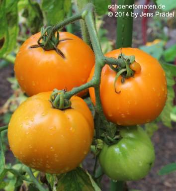 kleine Pflanze (1 bis 1,3 m) sehr früher Erntebeginn (Ende Juli) geringer Ertrag kleine bis mittelgroße (ø 5,5 bis 7 cm), runde, glatte, goldgelbe Früchte Manche Früchte haben eine kleine, stumpfe Spitze. größte geerntete Frucht: 112 g festes Fruchtfleisch, mildwürzig |