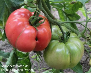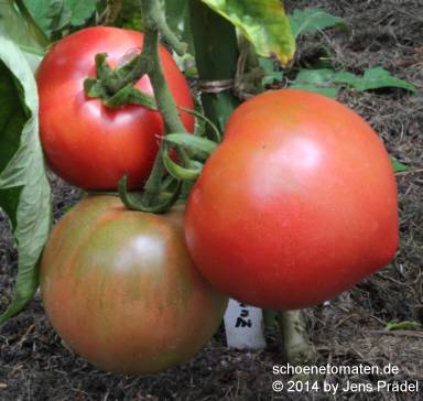 mittelgroße Pflanze (1,5 bis 1,7 m) früher Erntebeginn (Anfang August) geringer Ertrag teilweise sehr große (ø 10 cm), breitrunde, rote Früchte größte geerntete Frucht: 379 g aromatischer Geschmack, schmelzendes Fruchtfleisch |