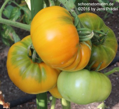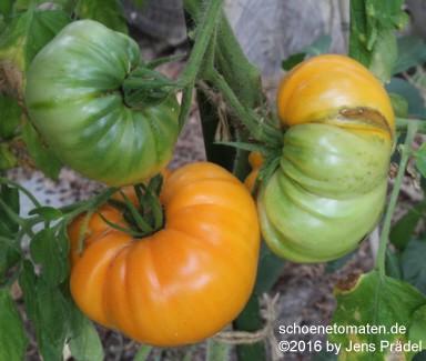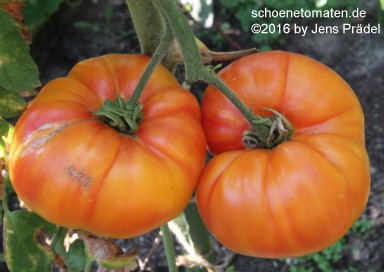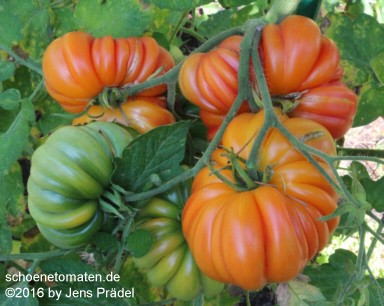 große (ø 9 bis 11 cm), breitrunde, leicht gerippte, orangerot gestreifte oder gefleckte Früchte