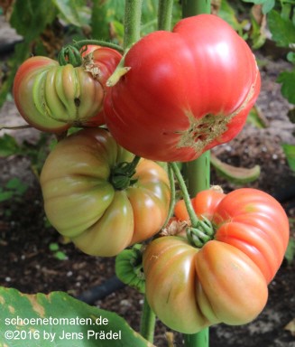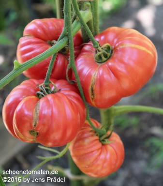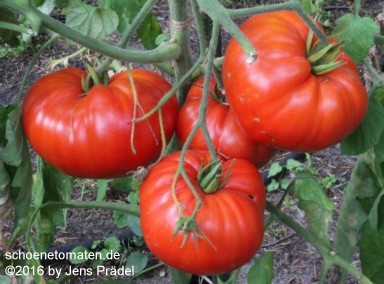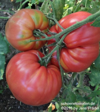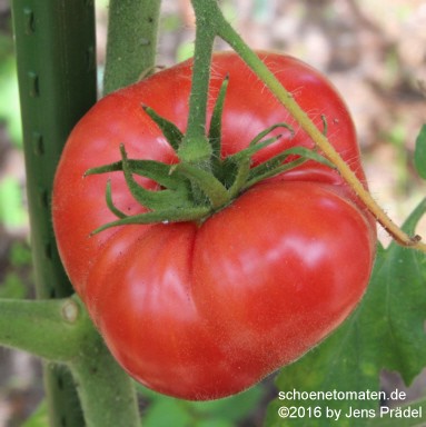 große (ø 8 bis 9 cm), breitrunde, nur leicht gekerbte, rote Früchte mit leichtem Grünkragen